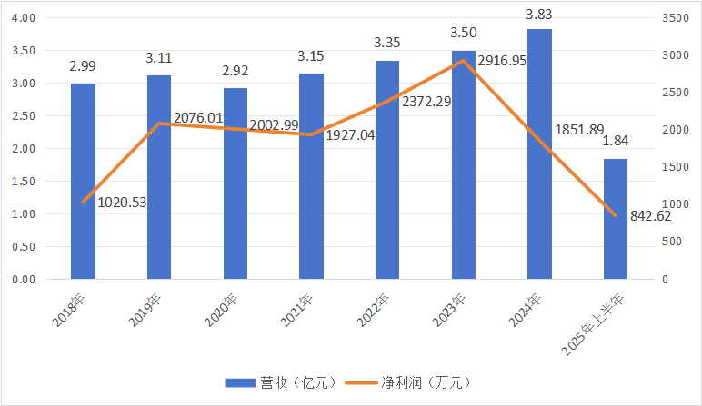 2025年上半年,實現營收1.84億元,同比增長7.82%;凈利潤842.62萬元,同比下降35.48%。